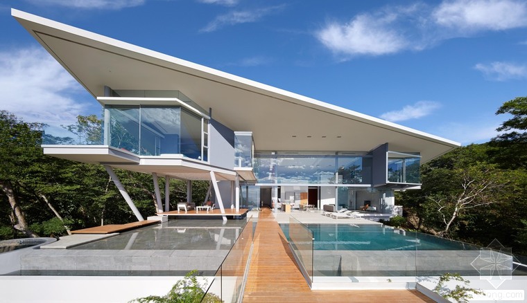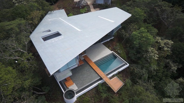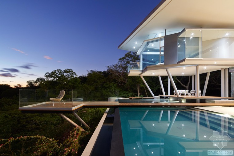 Indios Desnudos 別墅在加約半島,位處于朝海的一個尖端處,略向下傾斜的半島形山脊,兩邊有森林(其中一個是自然保護區(qū))。這個名字來自于場地里最有特點的一些樹:indio desnudo(赤裸的印第安人),它們組成了別墅的一個焦點,特別在居住區(qū)。別墅的設計旨在讓人享受室外生活和視野。因此,它被設計成在沒有空調的條件下仍然能舒適生活的建筑。室內空間與室外空間相整合,在室內的同時感覺像在室外。所有的居住空間都有通向大海或是森林保護區(qū)的視野。它有其主要的通向大堂的通道,你可以通過它看到社交區(qū)和大海。從這里你可以使用像木棧道一樣的走道,懸在分散的河石上,組成了流線的兩條軸線,組成樓層平面圖,或者使用樓梯通過橋梁到達兩個主臥室。