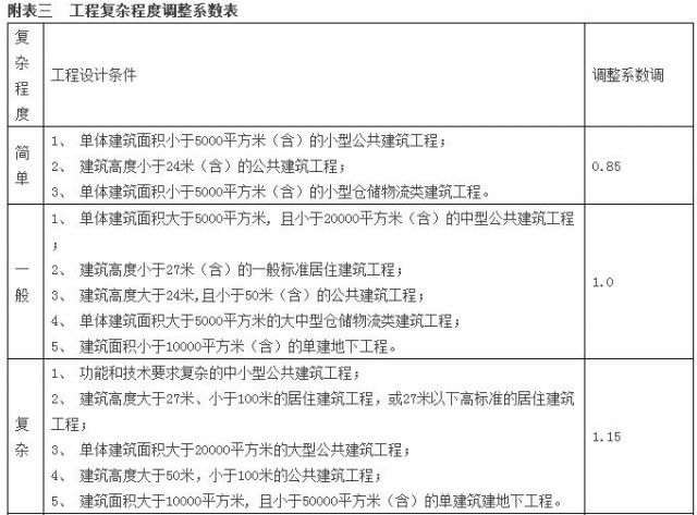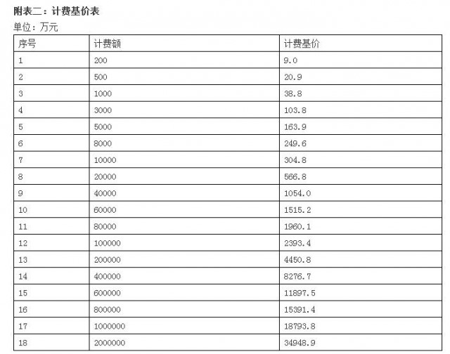 注:計費基價詳見附表二《計費基價表》,計費額處于兩個數(shù)值區(qū)間的,采用內(nèi)插法確定設(shè)計計費基價;工程復雜程度調(diào)整系數(shù)詳見附表三《工程復雜程度調(diào)整系數(shù)表》