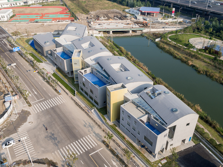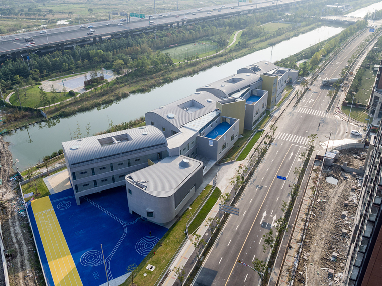 幼兒園是孩子們在成長過程中第一個接觸的公共空間。空間的尺度、使用的靈活度以及室內的場景和氛圍,對于幼兒的感受和認知都有很大影響,對于建筑師也是一個挑戰(zhàn)。設計要能激發(fā)孩子們探索和學習的興趣,同時要給他們足夠的安全感,要有家的感覺。在調研期間,設計團隊也發(fā)現,非正式空間-如活動室前的走廊-往往是孩子們生活、交往、嬉戲的重要場所。功能、空間與環(huán)境的關系,是本案在設計初始所面臨的主要矛盾和核心議題。張江萬科實驗幼兒園位于一個狹長的三角形地塊。基地南側為中環(huán)路高架與河道綠化,北側為高層住宅區(qū),東側為一座跨河道的車行橋,西側則為一棟需要容納在場地內的區(qū)域環(huán)網站。要做出一個回應場地限制條件并符合教育局規(guī)范標準的15個班全日制幼兒園,這塊特殊的基地便顯得極具挑戰(zhàn)性。建筑師需要在滿足規(guī)劃指標、使用面積、規(guī)范性、安全性等硬性要求的前提下,在一個相對局促的場地里,創(chuàng)造出符合老師教學管理、誘發(fā)兒童探索心理、和滿足家長預期的幼兒園。